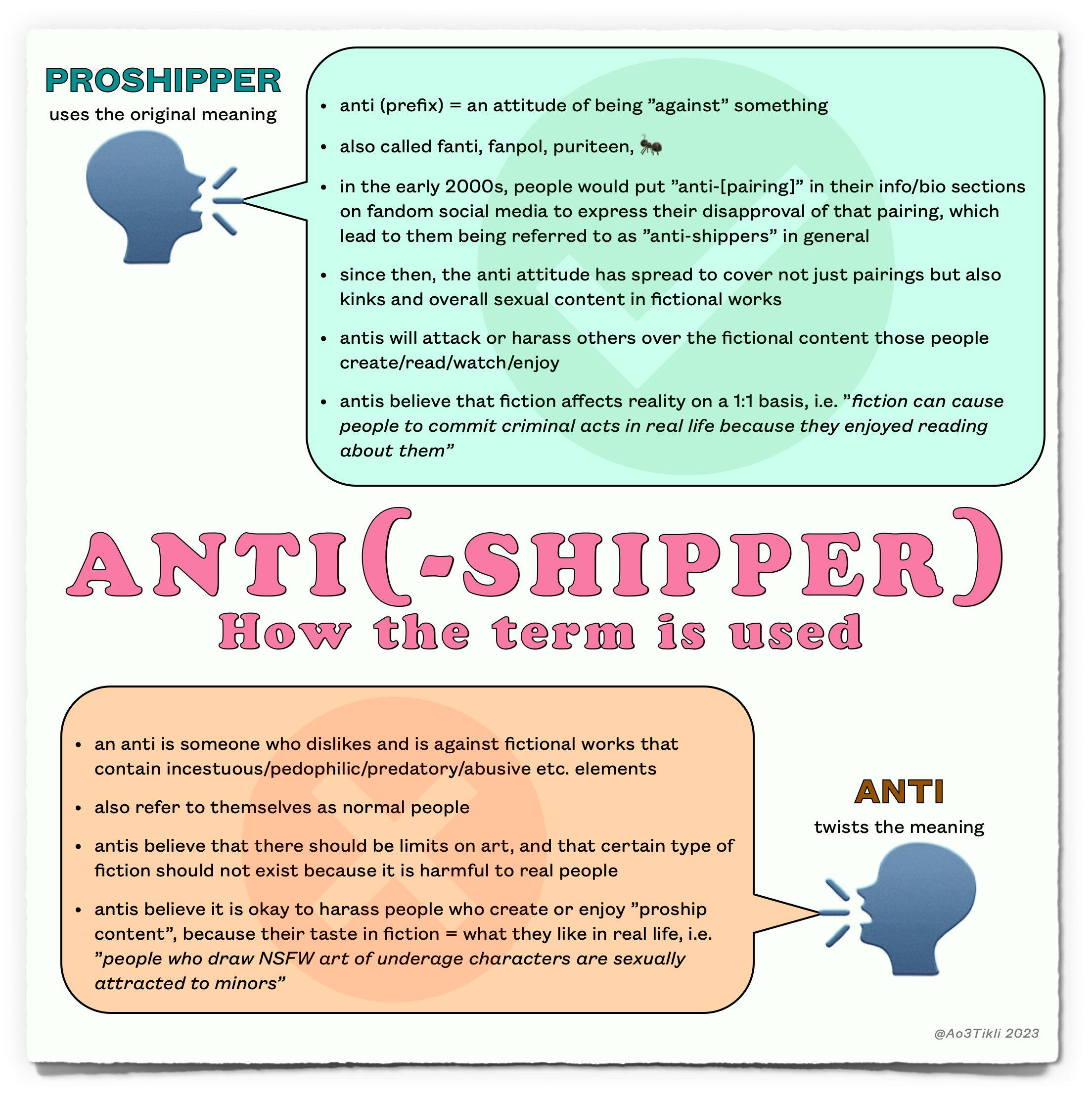 We believe fiction is the best and safest way for people to explore ideas or ships, including problematic ones, in a way that are safe and separate from reality, and that people should not be harassed, doxed, or sent death threats for doing so.We do not support morality-policing of fictional content.We do not believe that exploring those ideas or consuming media that has problematic themes explicitly means that an individual condones, endorses, or desires to recreate those behaviours in real / external life.We believe in individual agency, for people to choose to scroll away from fictional content that makes them uncomfortable, using tools widely available such as Content / Trigger Warnings, muted word lists and blocking.Weaponized Purity Culture and Censorship creates environments where serious subjects get swept under the rug, and safety tools become taboo to employ at all, on threat of ostracization, which allows people with actual predatory intent to get closer to vulnerable people.